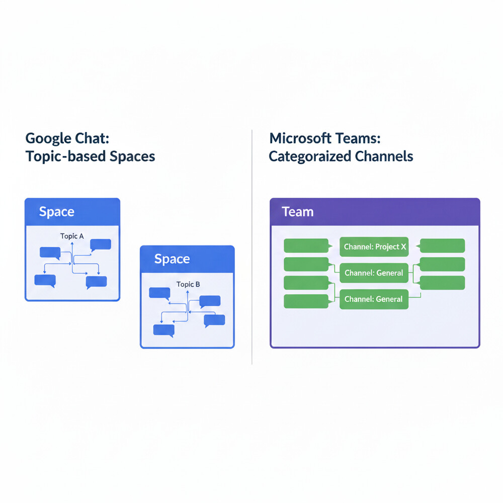 Google Workspace ユーザーが次に戸惑うのが、コミュニケーションの「場所」と「作法」の違いです。特に、会話の流れをどう整理するかに大きな思想の違いがあります。