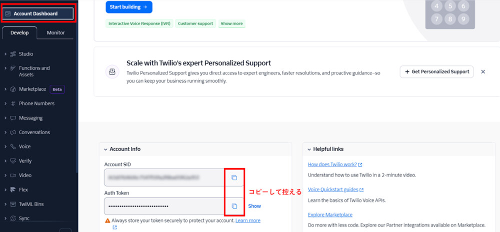 2.アカウントダッシュボードからAccount SIDとAuth Tokenを確認し、メモなどに控えておきます。