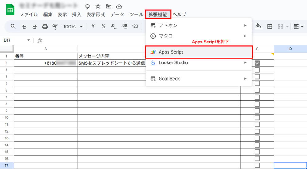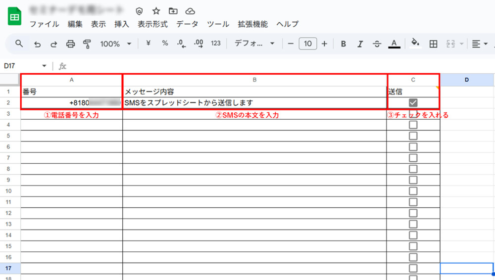 2.スプレッドシートのA列に送り先電話番号(国際電話識別番号から始まる形式)を入力し、B列には任意の文字列、C列にチェックを入れます。