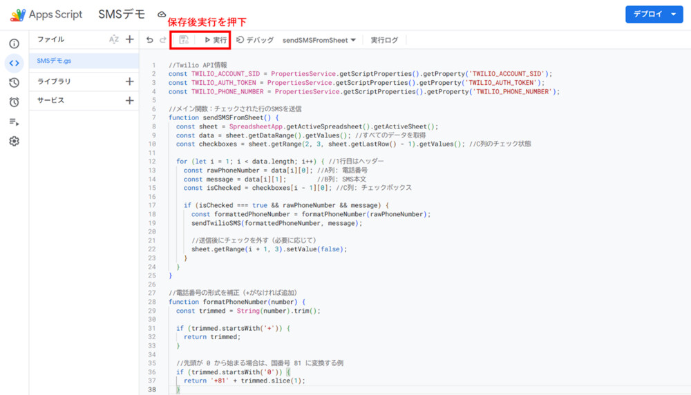 TwilioのAPI情報や送信元番号は、直接コード内に記載するのではなく、スクリプトプロパティで管理することを推奨します。