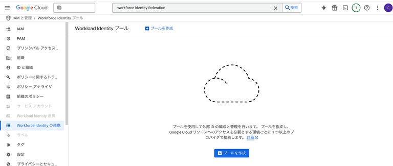 Google Cloud コンソールで Workforce Identity Pool のコンソールを開く。組織を選択