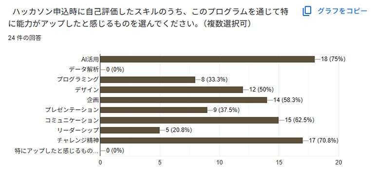 これらの結果から、本ハッカソンは短期間での成果発表にとどまらず、AI時代を生き抜く実践的スキルの習得、挑戦を楽しむ姿勢の培い、そしてキャリア観の深化に大きく寄与したことが明らかになりました。