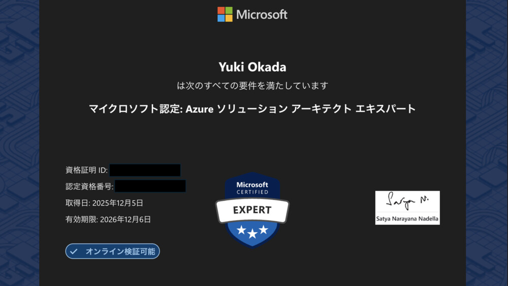 私は2025年12月に「Microsoft Certified: Azure Solutions Architect Expert(AZ-305)」の資格試験に合格しました。AZ-305はAzure資格の中でも上級に位置付けられている資格であり、新卒で実務経験も少ない私でも受かるのだろうかという不安を抱えながら勉強を始めました。