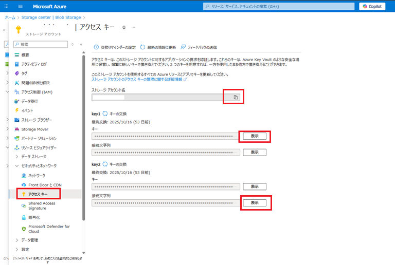 ストレージアカウント> セキュリティとネットワーク>アクセスキー