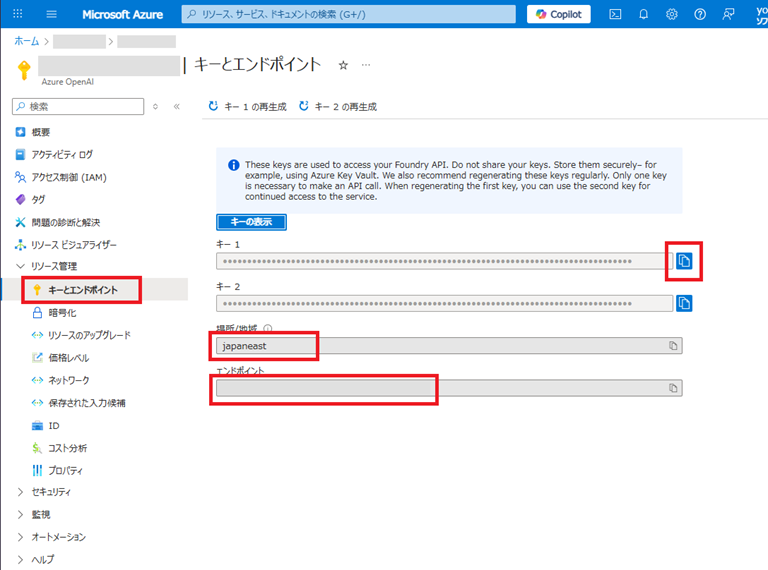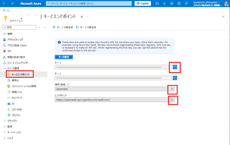 「キー」、場所/地域」(リージョン)、「エンドポイント」をコピーして保存します。
