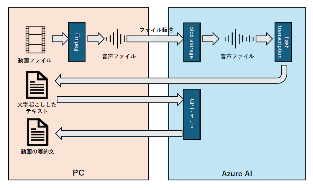 | 使用する機能 | * whisper / GPT-4o-transcribe(音声 → テキスト) * GPT-5(要約生成) | * fast transcription または batch transcription(音声 → テキスト) ※fast transcription は高速、batch transcription は非同期で低速だがコスト低め * blob storage(音声ファイルの保存場所) ※API から直接音声を送り込めないため必須 * GPT-4.1(要約生成) | Gemini 2.5 Flash-Lite |