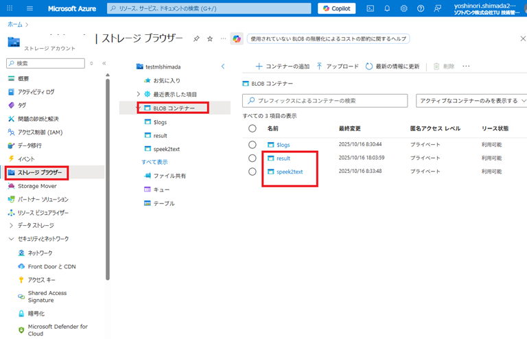 ストレージアカウント>ストレージブラウザ>blobコンテナー