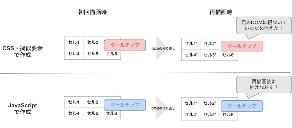 つまり、Handsontable ではセルのDOMが再生成されると、擬似要素を付与した元の要素が別の要素に置き換えられ、結果としてツールチップが表示されなくなる、というのが原因でした。