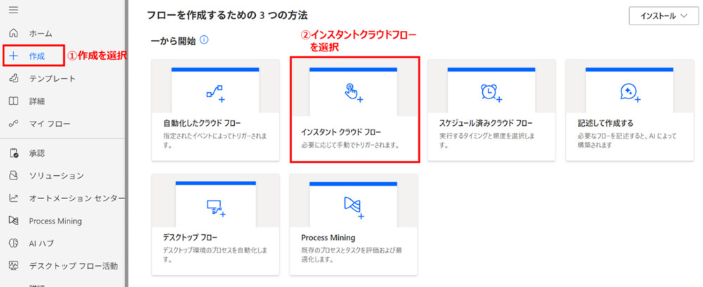 1.Power Automateクラウドフローから作成を選択し、インスタントクラウドフローを開きます。