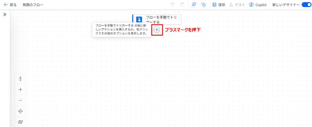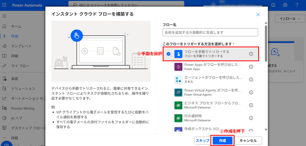 2.フローを手動でトリガーするを選択し、作成を押下します。