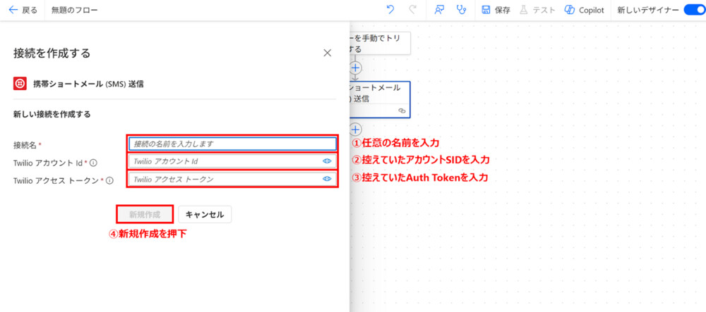 5.任意の接続名(Twilioのアカウント名を設定すると分かりやすいです)を入力し、控えておいたAccount SIDとAuth Tokenをそれぞれ入力します。その後、「新規作成」を押下してください。