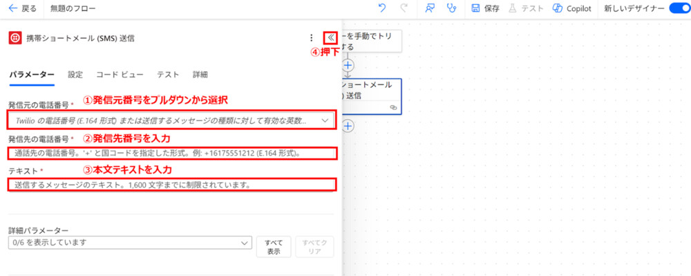 6.発信元の番号は、プルダウンから+1から始まる米国の電話番号を選択してください。発信先の電話番号は、+81から始まる形式で入力します(例:+818012345678)。テキスト欄には、送信するSMS本文の内容を入力してください。