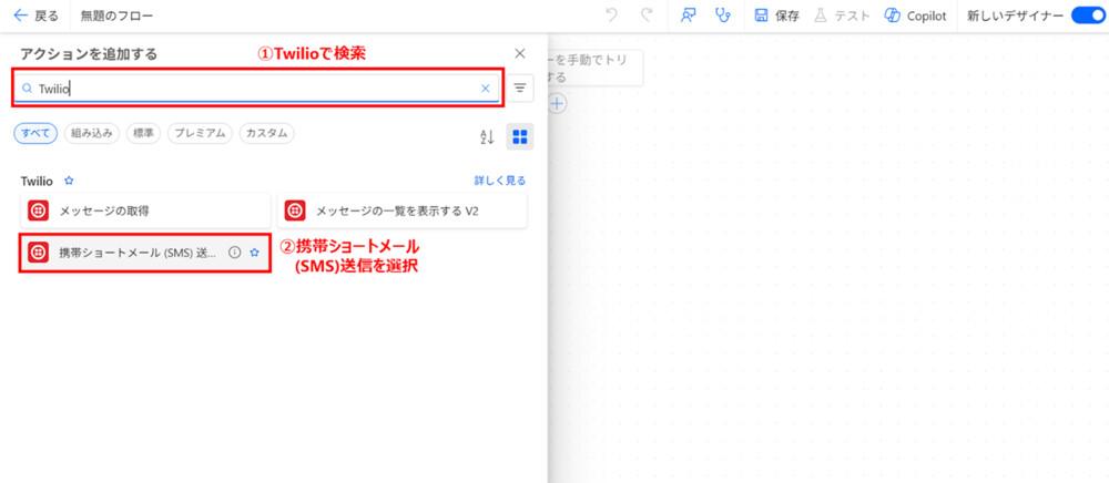 4.検索欄からTwilioを検索し、携帯ショートメール(SMS)送信を選択します。