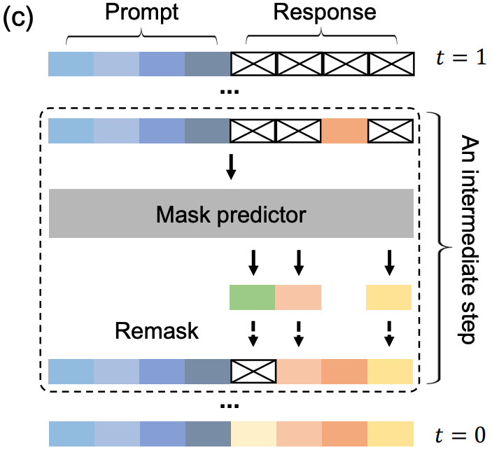 (c)推論:解答部分のトークンをすべてマスクした状態から開始し、確度の高い箇所から段階的に復元す