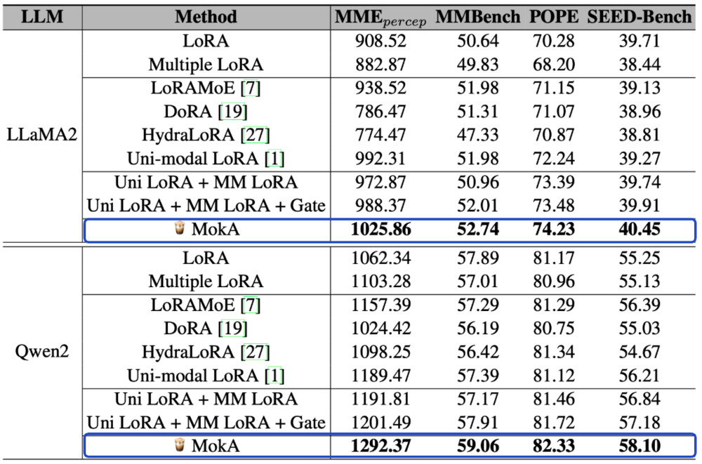 マルチモーダルLLM(MLLM)に効果的なLoRAアダプターを提案した論文です。モーダル内の特徴抽出とモーダル間の相互作用計算を明示的に分離することで、Visual-TextとAudio-Visual-TextのQAタスクで性能が向上することを示しています。