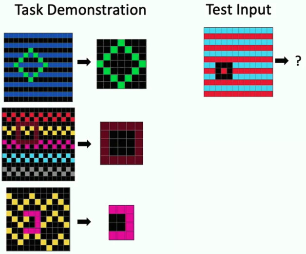 この問題を踏まえて、同氏はLLMの認知能力を測るための新たな評価手法を作成しました。本手法は、問題文(タスクの説明)を明示せず、例題と解答のペアからタスク内容を理解できるように設計されています。例えば下図では、「画像の中からパターンの異なる領域を切り出す」というタスクを三つの例題から推測できます。