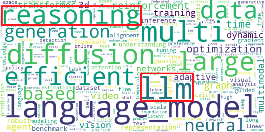 昨年と比較して、「LLM」と「Reasoning」の二つの単語の出現頻度が大きく増加しました。ここでは、それぞれの増加の背景を分析します。