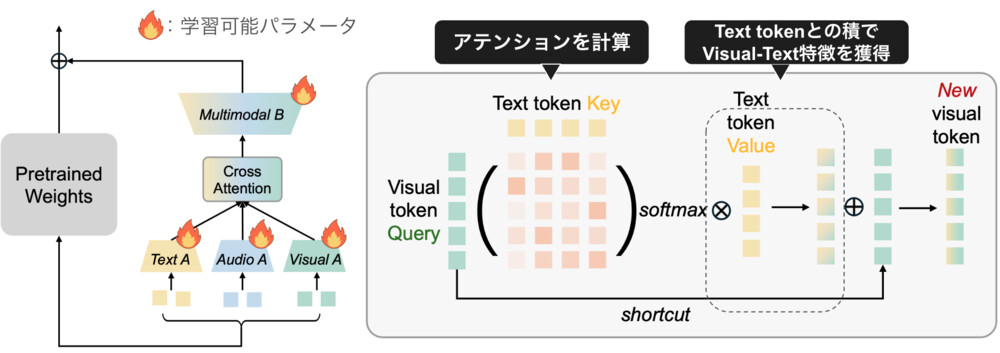 特定モーダルへの依存を避けるために、各モーダル専用の学習パラメータを用意します。加えて、モーダル間の情報をより活かすため、相互作用を明示的に計算する仕組みをLoRAアダプターに組み込みます。