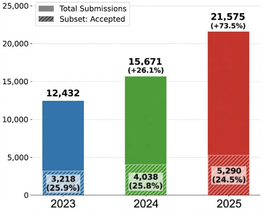 NeurIPS 2025に投稿された論文は21,575本、採択数は5,290本、採択率は24.5%です。以下のグラフは2年前からの論文数、採択数、採択率の推移を示しています。投稿論文数は年々増加しており、特に今年は昨年と比較して37%以上増加しています。一方で、採択率は概ね25%前後で推移していることがわかります。