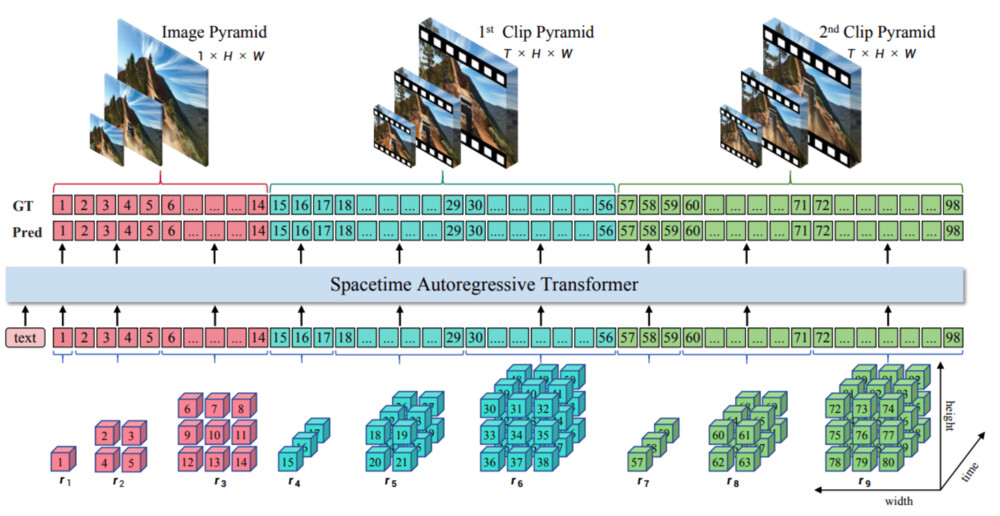 自己回帰型のTransformerに基づくモデルで、同一モデル内で画像生成・動画生成・動画外挿(動画の続きを生成するタスク)を統一しています。画像ピラミッドで得た静的構造を動画生成に利用したり、動画生成で得たクリップピラミッドを動画外挿に利用したりすることで、整合性の高い生成を実現します。