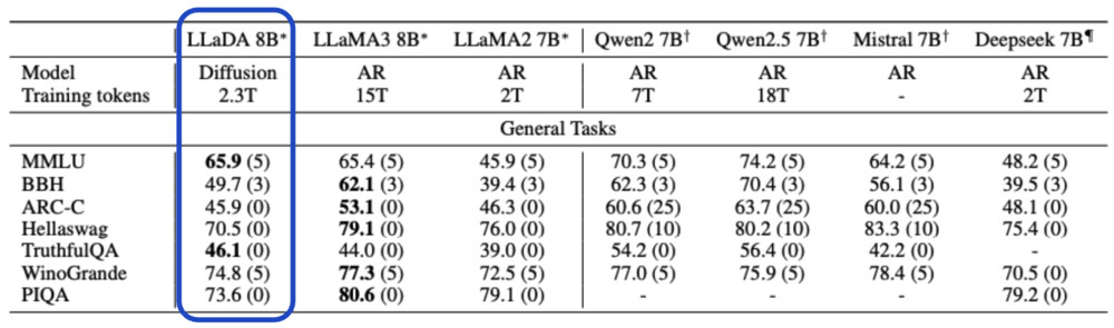複数のベンチマークで同等以上のスコアを示し、自己回帰型LLMと比較しても総合的に競争力のある性能を示しています。