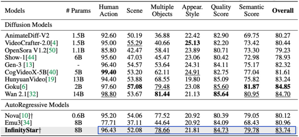 物体の位置関係、動画品質、動きの自然さなどを指標ごとに測定しており、既存の有力な自己回帰モデルを上回る結果が示されています。本手法が、空間的・時間的に一貫性の高い動画を生成可能であることがわかります。
