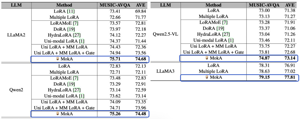 4つの学習済みモデルにLoRAアダプターを追加して評価しています。音声モーダルを含むタスクでも、比較した手法の中で最も高い精度を示しており、提案手法の優位性が示唆されています。