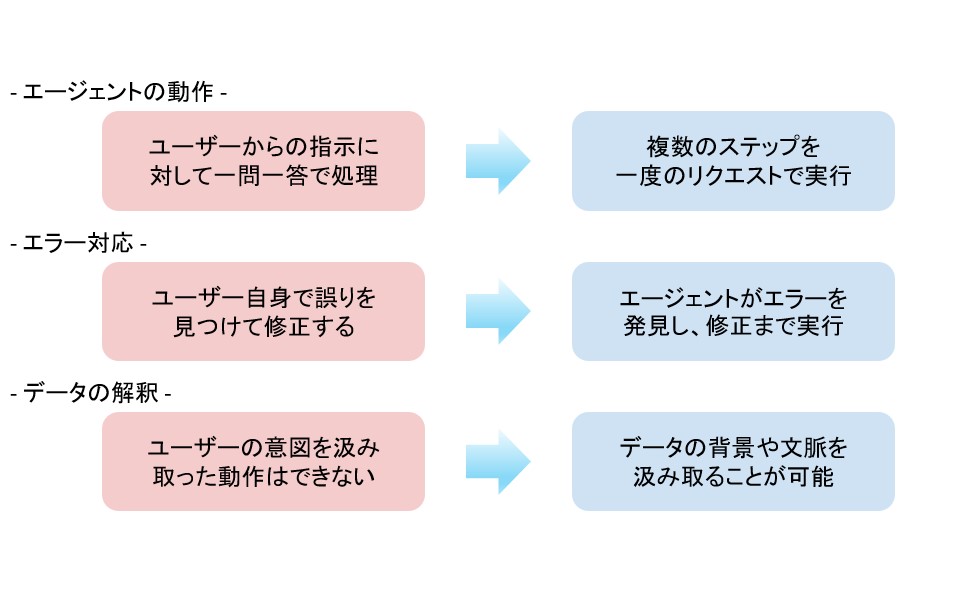 一方、エージェント モードでは Copilot が目的を理解し、複数のステップをまとめて実行できるようになります。以前の Copilot では一度に大量の条件を含んだリクエストを行っても実行してくれなかったり、データの意味を理解して必要に応じて修正することはできませんでした。しかしエージェントモードでは、人が Excel で分析するときのように、「まずデータの整理 → データの文脈を理解→必要に応じてデータの修正→次に比較 → 最後に要点をまとめる」といった段階的な複雑な思考プロセスを Copilot が一度のリクエストで実行可能になり、より高度な作業にもエージェントのみで対応ができるようになりました。