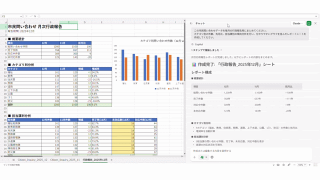 カテゴリ別の件数、先月比、担当課別の傾向分析を行い、分かりやすいグラフを含んだレポートシートを作成してください。
