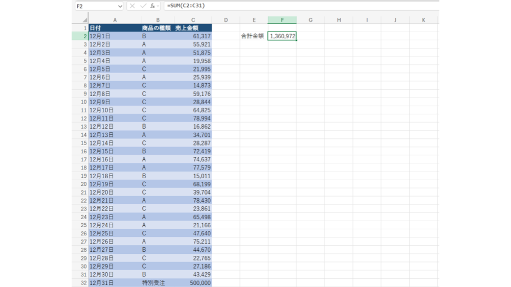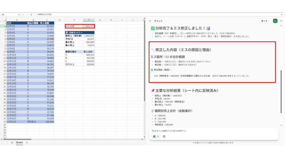 以上をふまえて、Excel のエージェントモードが分析をする際に修正までしてくれるのかを検証してみます。人間であればセルを確認して「12月全体の売り上げの計算をしたかったのに最終日が含まれていないなー」と分かり修正すると思いますが、果たして AI はこの人間が判断している部分の処理も可能なのでしょうか?