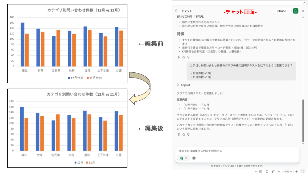 従来の Excel の Copilot は「質問に答える」、「数式やグラフを提案する」といった単発の支援が中心でした。