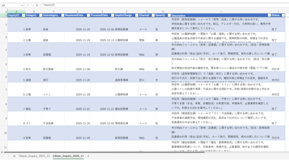 この市民問い合わせデータを毎月の行政報告用にまとめてください。
