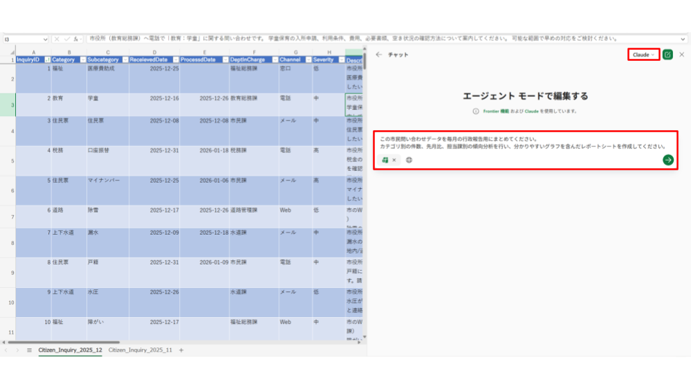 結論を言うと、Excel のエージェントモードは「分析担当者のように自律的に進める」ことが可能になりました。