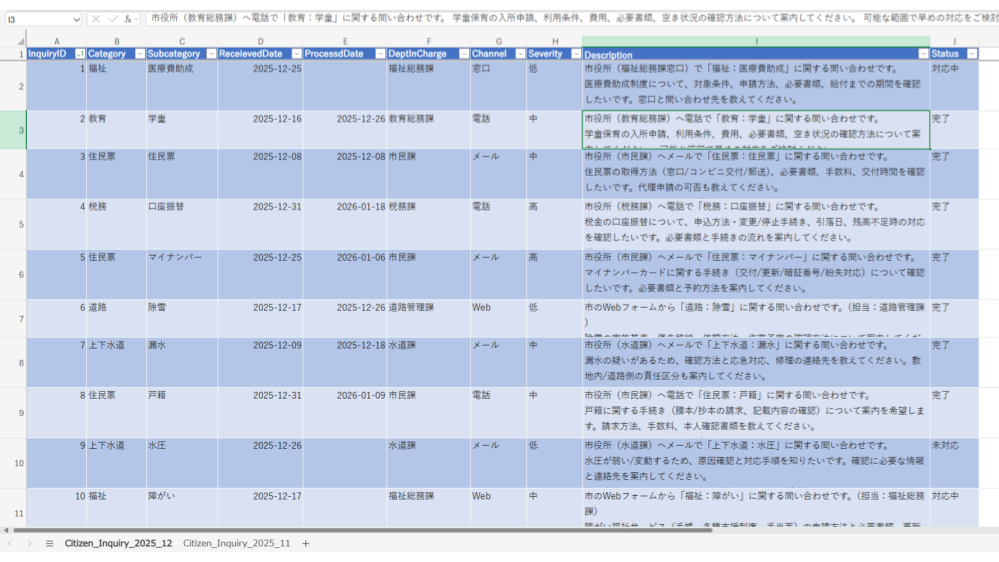 さっそく Excel のエージェントモードを使って、架空のデータを分析してみましょう。用意したのは以下のような「問い合わせ対応の履歴シート」です。ちなみに私の Excel のスキルレベルは以前と同じで、数式をほとんど書けないレベルです…