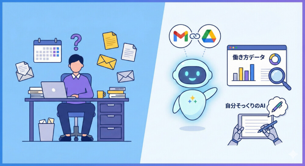 日々の業務に追われていると、自分自身の働き方やコミュニケーションの癖を振り返る時間はなかなか取れないものです。しかし、実はあなたのGoogle Workspace (GmailやGoogleドライブ)の中には、あなたの「働き方のデータ」が宝の山として眠っています。