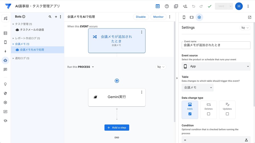 さらに生成AI(Gemini)と連携させるための処理(自動化)なども、視覚的にわかりやすく設定することができます。
