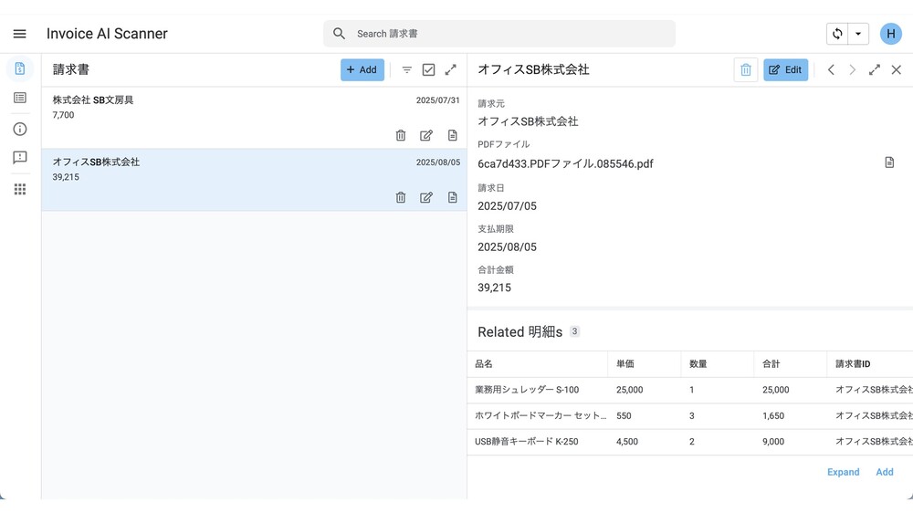 裏側でAIが内容を解析し、会社名や金額、明細などのデータを抽出します。