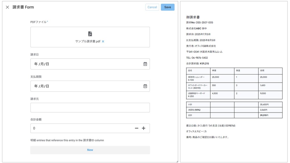 左側のアプリのフォーム画面に、右側の請求書ファイルをアップロードします。