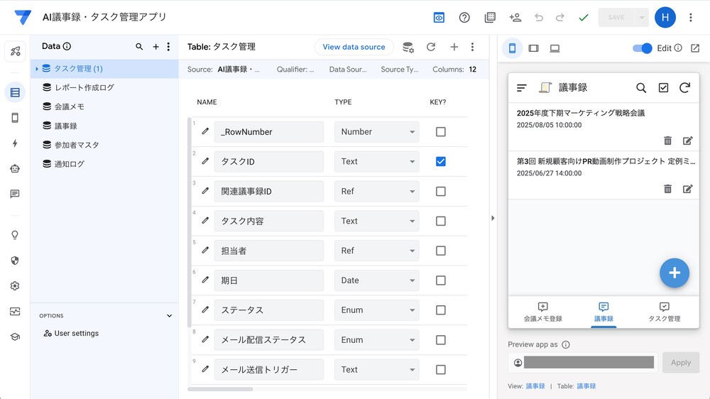 AppSheetを使えば、プログラミングの専門知識は不要です。普段使っているスプレッドシートが、数クリックでアプリに変身します。しかも、現場で撮影した画像や、録音した音声をそのままGeminiに渡す連携まで、サクッとできてしまいます。