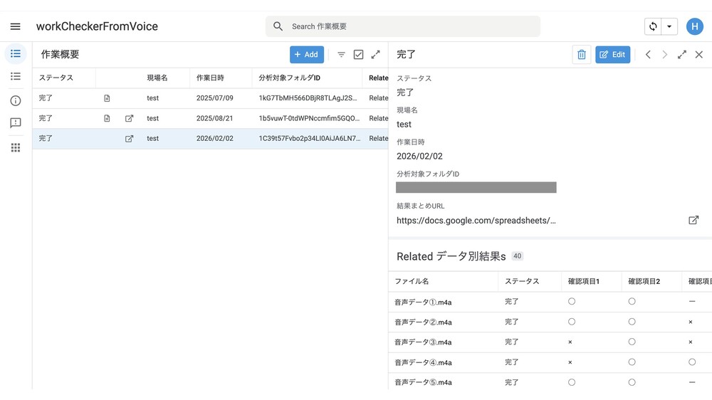 音声データをアップロードするだけで、AIが自動でチェックリストを判定してくれます。右下の表のように、報告漏れがある項目は「×」で一覧表示されるため、管理者は一目でチェック状況を把握できます。