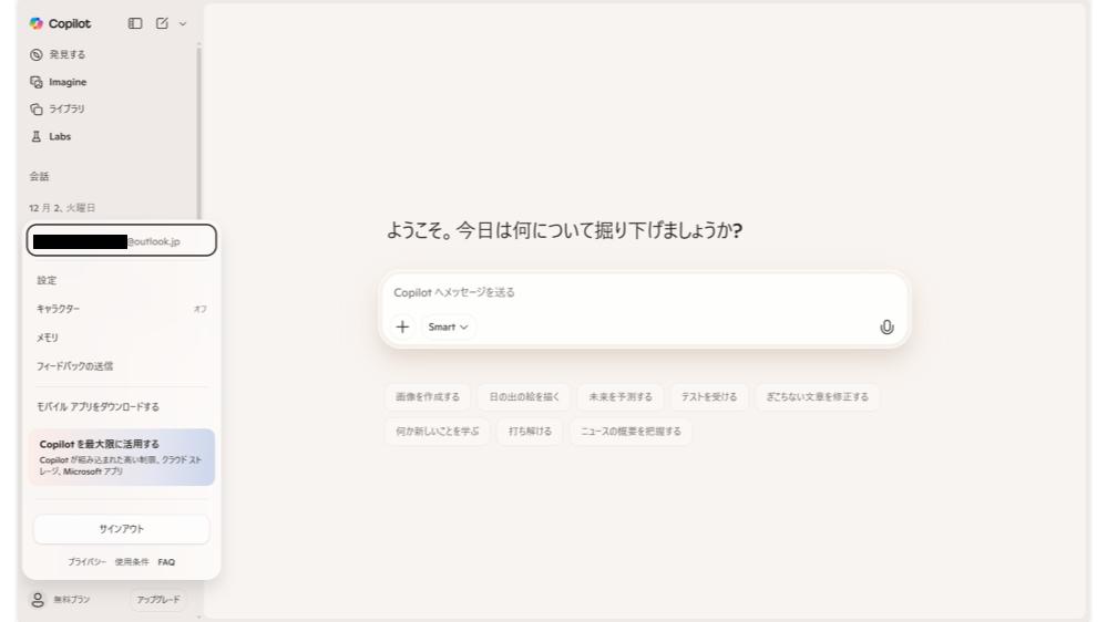 以下、Microsoft アカウントで Microsoft Copilot にログインした際の画面になります。