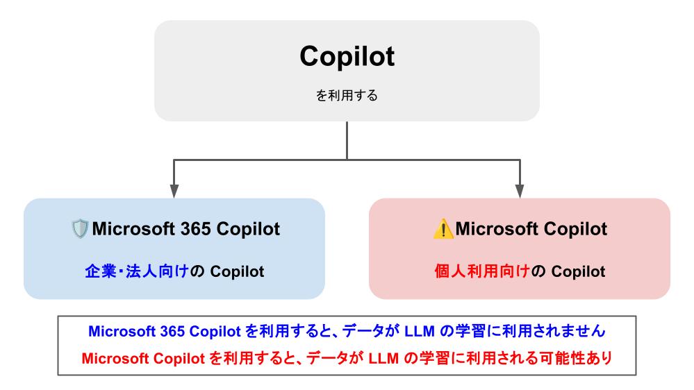 ②コンシューマー版に用意されている Microsoft Copilot を利用してしまうと、基礎 LLM の学習にデータが使用されてしまう恐れがあります。
