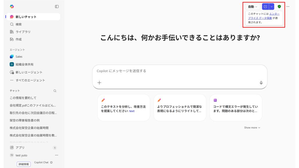 赤枠の「このチャットにはエンタープライズデータ保護が適用されます」という表示が出ると思いますが、まさにこれが基礎 LLM にデータが学習されないことを示唆する内容です。
