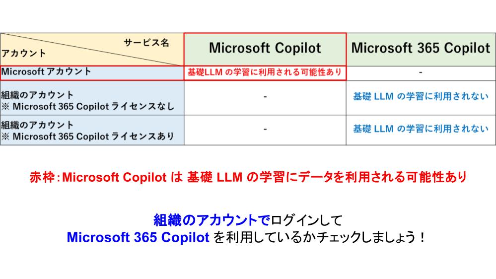 逆に Microsoft Copilot (基礎 LLM にデータを学習される可能性がある) は、組織アカウントでは利用することができません。組織のアカウントで Microsoft 365 Copilot を利用できているかをユーザー個人で確認するリテラシーが大切になってくると思いますので、安全に Copilot を利用するためにもチェックしていただくことをお勧めいたします。