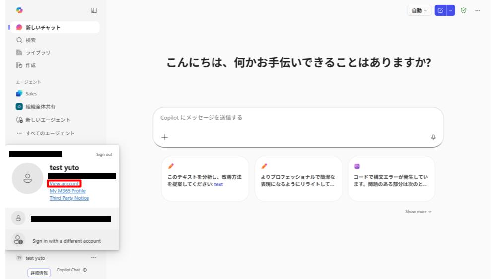 Microsoft 365 Copilot を利用している UI からアカウント情報を確認して、そのアカウントが組織から提供されているものかを確認してみましょう。