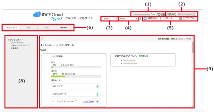 (6) 「ダッシュボード」タブ ご契約のリソースの現在の使用量、グローバルIPアドレスなどを確認します。複数サイトをご契約の場合は、選択したサイトの情報が表示されます。