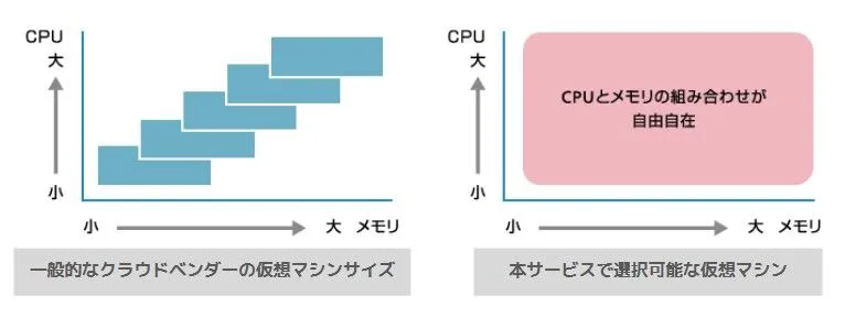 仮想マシンは、新規作成はもちろん、テンプレートやISOイメージからの作成も可能です。また、仮想マシンのサイズ定義がないため、お客さまのお好きなサイズ(CPU、メモリ、ストレージ)で作成が可能です。