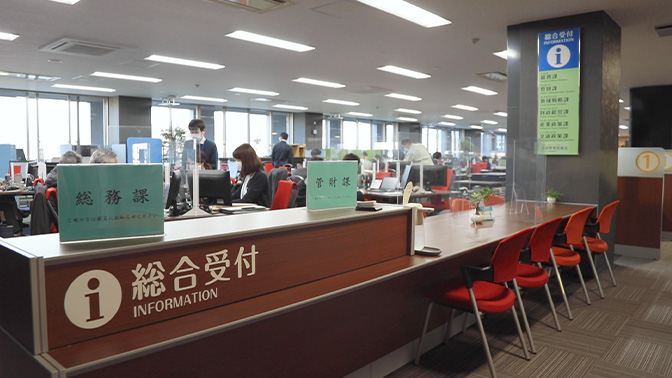2階総合受付の奥側がフリーアドレス化された執務スペース。
