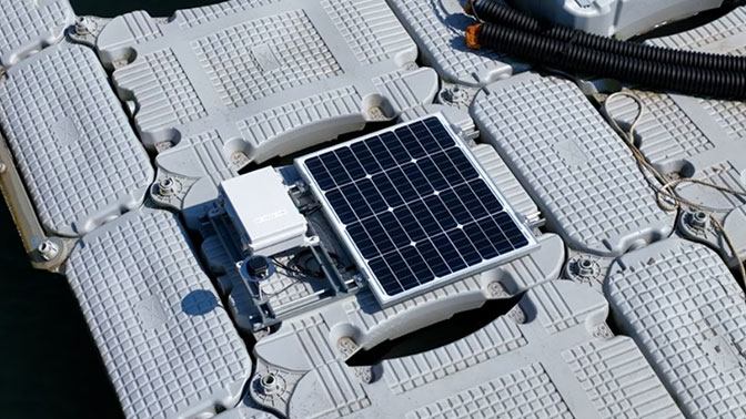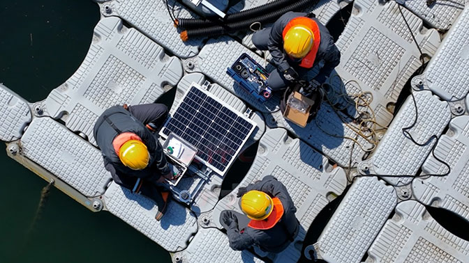 水上メガソーラー早期警戒システムのセンサーをアイランド上に設置している様子