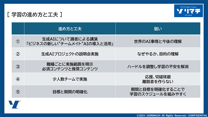 生成AIが話題になると、すぐに取り組みはじめたソリマチ。経営層からの指示により、まずは全社で取り組もうとなったものの、早期に取り組みはじめたが故に生成AIとは何か、何ができるのかという状態だったことから、まずは知ることからはじめたと言います。